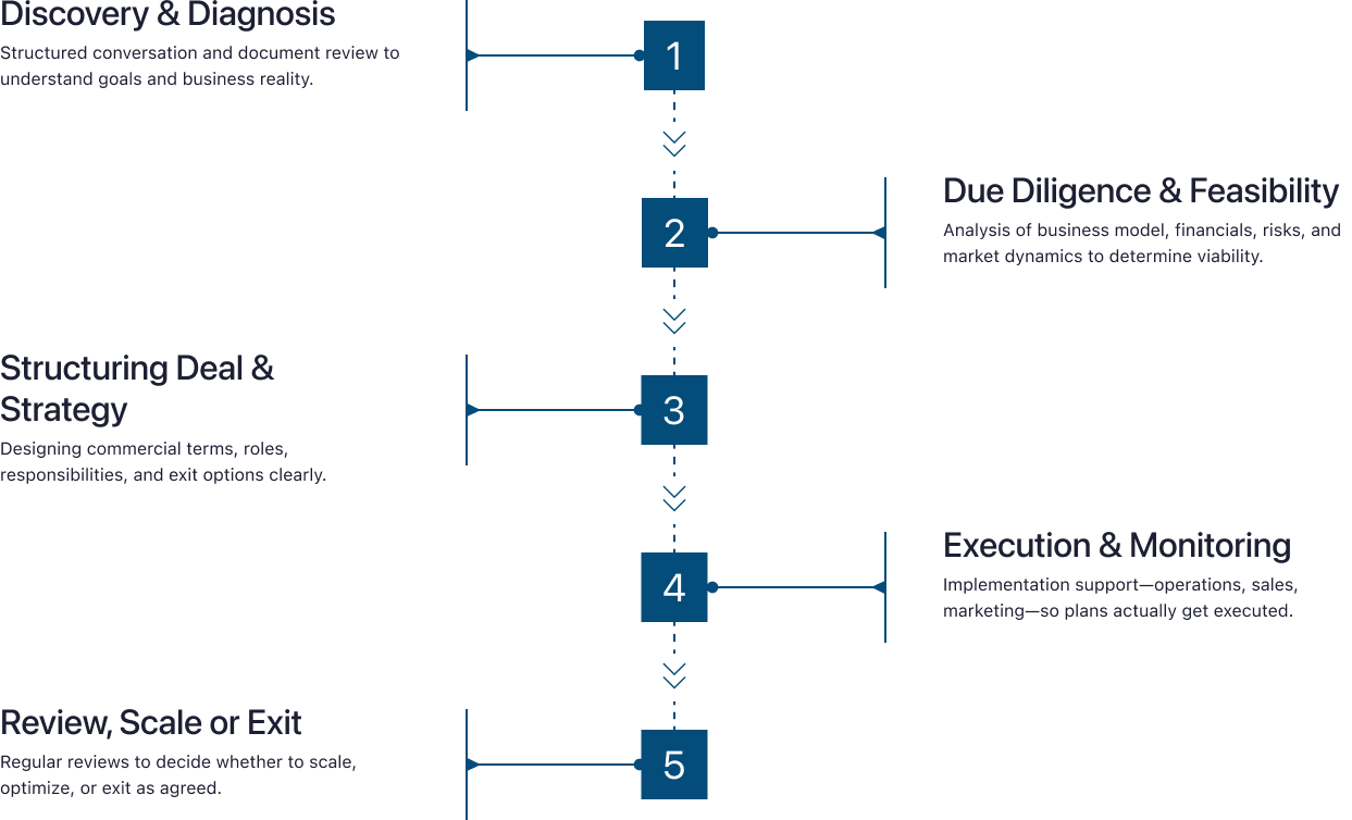 We work with two sides of the same challenge: investors looking for strong, well-structured opportunities, and business owners who need strategy, systems, and funding to grow. Our role is to design the right structure, perform deep due diligence, and then help execute the plan so both parties are protected and profitable.
